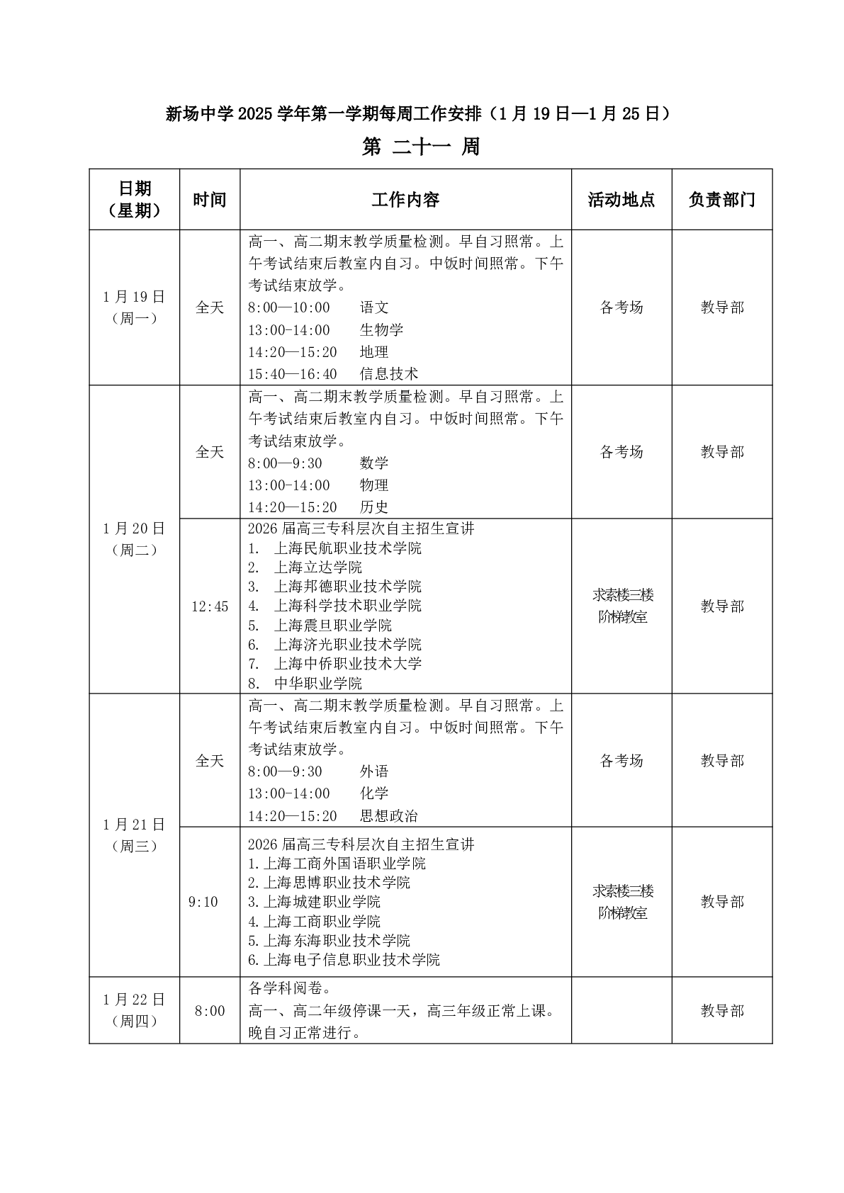 2025学年第一学期新场中学第二十一周工作安排