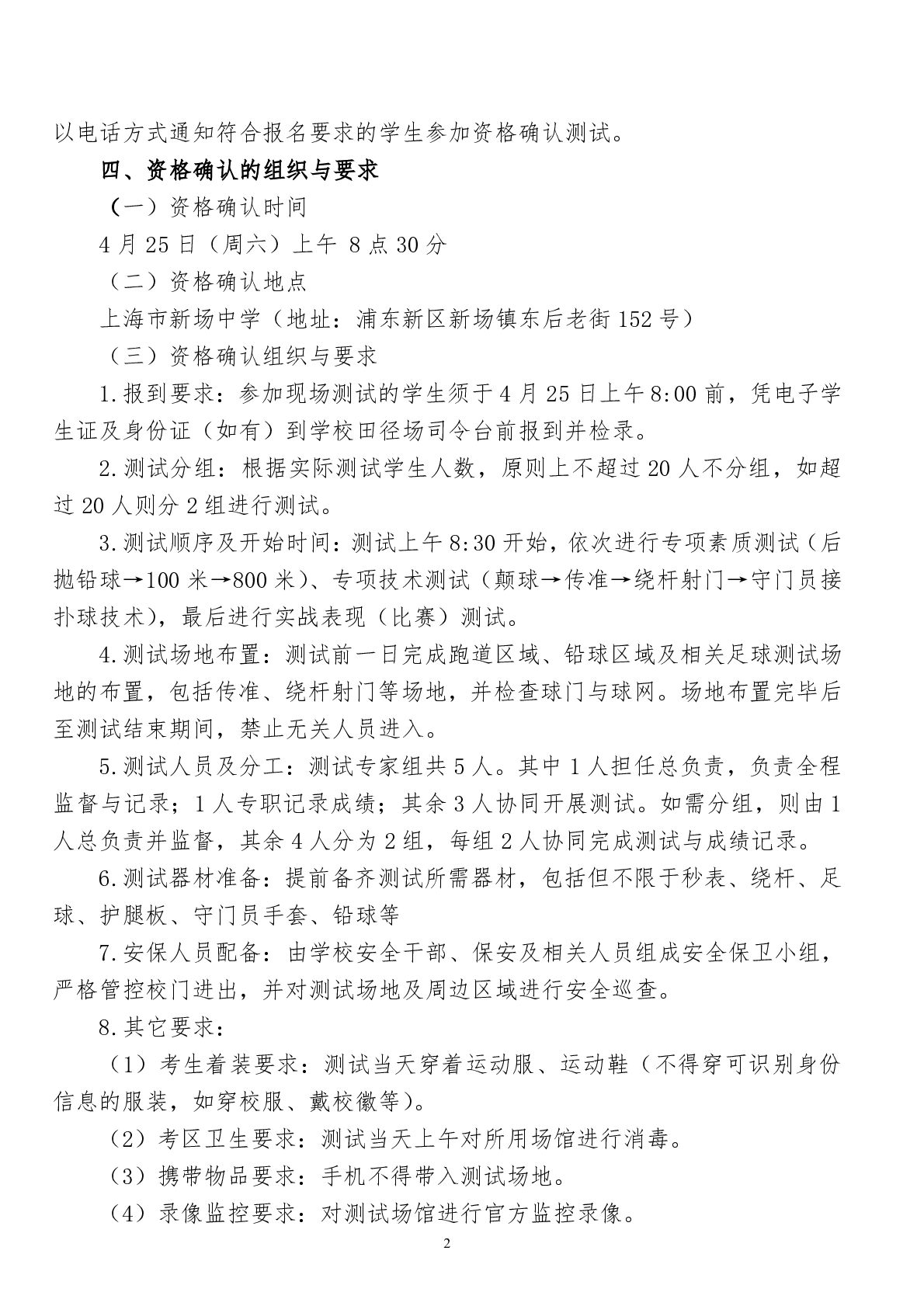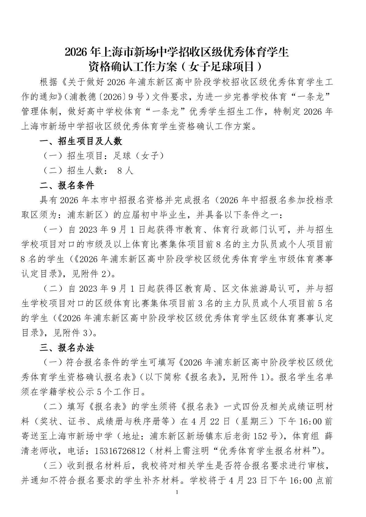 2026年上海市新场中学招收区级优秀体育学生工作方案女子足球项目